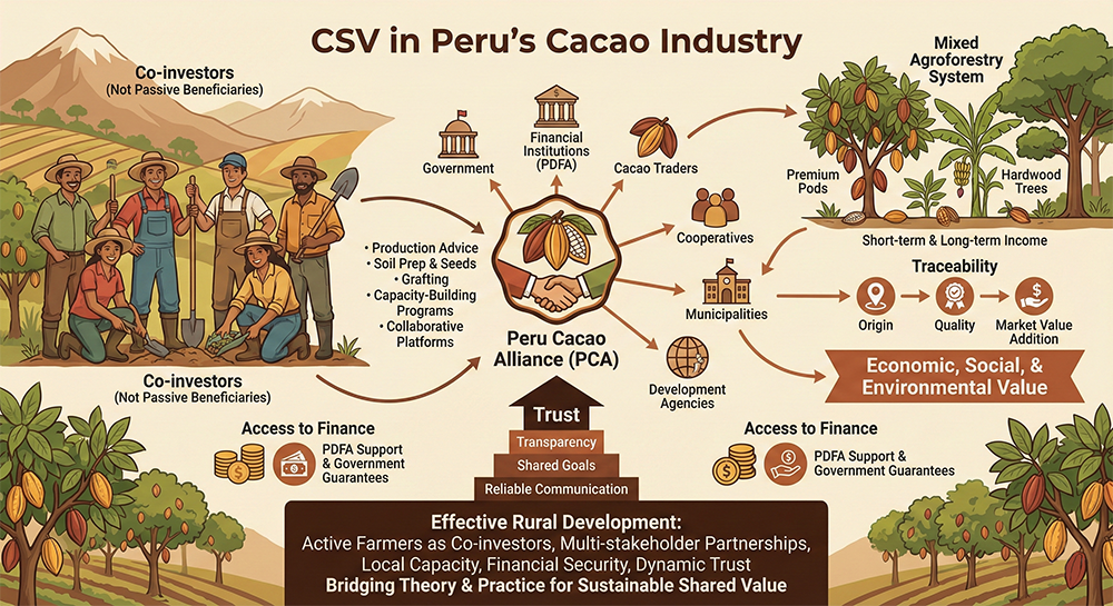 การศึกษาเรื่องของการพัฒนาเกษตรกรรายย่อยในอุตสาหกรรมการเกษตร Cacao ของเปรู Borda และคณะ (2021) พบว่า เกษตรกรราบย่อยที่ยากจนมีสถานะของการเป็นผู้ปฏิบัติการที่เป็น “ผู้ร่วมลงทุน” (Co-investors) ด้วย ไม่ได้มีฐานะเป็น “Passive beneficiaries” มีการรวมตัวกันจัดตั้งองค์กรที่เรียกว่า Farmers in the Peru Cacao Alliance (PCA) เพื่อทำหน้าที่แนะนำส่งเสริมงานด้านการผลิต การเตรียมดิน เมล็ดพันธุ์ การต่อยอด/ทาบกิ่งที่มีการทำงานร่วมกับพันธมิตรอื่น ๆ มีการสร้างแรงจูงใจ สร้างพันธะสัญญาเพิ่มผลผลิต และสร้างหลักประกันความยั่งยืน มีการพัฒนาความสามารถที่จะนำไปสู่การปรับปรุงผลิตภาพและความสม่ำเสมอที่เรียกว่า Capacity-building programs ทำงานร่วมกับพันธมิตรผู้มีส่วนได้เสียที่หลากหลายทั้งรัฐบาล สถาบันทางการเงิน ผู้ค้าคาคาว สหกรณ์ เทศบาล และหน่วยงานพัฒนา รวมทั้งมีการสร้างพื้นที่การทำงานแบบ Platforms เพื่อการนี้โดยเฉพาะ (Borda et al., 2021) PCA ทำหน้าที่ให้คำแนะนำให้เกษตรกรทำการผลิตคาคาวที่ได้รับพรีเมียม ผสมกับการผลิตแบบ mixed agroforestry system ที่มีทั้งกล้วย ไม้เนื้อแข็ง ที่จัดให้มีกระแสรายได้ทั้ง short-term and long-term income พร้อม ๆ ไปกับการพัฒนาตนเองไปกับระบบการตรวจสอบย้อนกลับ (Traceability) ทั้งเรื่องแหล่งกำเนิด และคุณภาพ รวมทั้งการเพิ่มมูลค่าทางการตลาด อันเป็นการสร้างคุณค่าทางเศรษฐกิจ สังคม และสิ่งแวดล้อมไปพร้อมกัน (Borda et al., 2021) จัดให้มีการพัฒนาการเข้าถึงแหล่งทุน (Access to finance) ตามการทำงานของ The Peruvian Development Finance Association (PDFA) ที่ให้มี microfinance สนับสนุนแหล่งเงินสำหรับเกษตรกรที่ปรับปรุงการผลิตตามเงื่อนไขของการพัฒนา และร่วมกันสร้างความเชื่อถือ (Trust) ตามหลักการที่ว่าความเชื่อถือไม่อาจจะเกิดขึ้นโดยอัตโนมัติ แต่จะเกิดขึ้นไปตามองค์ประกอบของการสนับสนุน ความโปร่งใส การสร้างจุดหมายร่วมกัน และการสื่อสารที่เชื่อถือได้ พร้อมจัดหาหลักประกันด้านต่าง ๆ ของรัฐมาสมทบเพื่อลดความเสี่ยงของธุรกิจ (Borda et al., 2021)