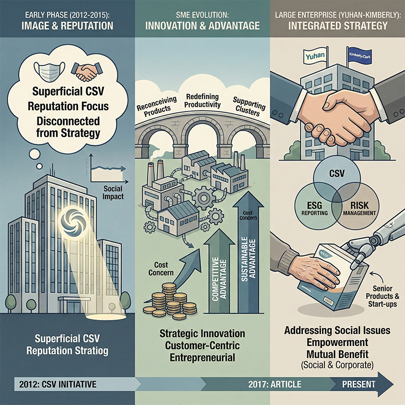 แต่ ผลการสำรวจข้อมูลการนำเอาเรื่อง CSV ไปสร้างสรรค์เป็นกลยุทธ์ธุรกิจในกิจการขนาดเล็ก โรงงาน และ SMEs จำนวน 294 แห่งในเกาหลีใต้ พบว่า มีพัฒนาการของการปรับมุมมองจาก Traditional CSR ไปสู่ CSV ตามบทบาทของ Strategic innovation-driven, customer-centric approach เปลี่ยนจากความกังวลเรื่องต้นทุนไปสู่ “การสร้างความได้เปรียบทางการแข่งขัน” (Competitive advantage) ควบคู่ไปกับ “การสร้างความได้เปรียบจากการจัดการความยั่งยืน” (Sustainable advantage) ตามมิติของการพัฒนางานในพื้นที่ต่าง ๆ ของการสร้างคุณค่า ทั้ง Reconceiving products and markets, redefining productivity in value chains, and supporting cluster development และ “การมุ่งเน้นความเป็นผู้ประกอบการ” (Entrepreneurial Oriented) (Seo et al., 2023)